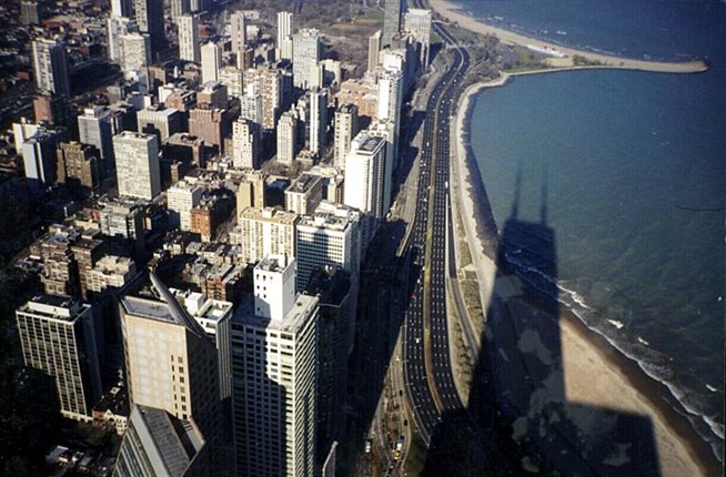 Лейк-Шор-драйв — одна из самых красивых магистралей Чикаго, тянется вдоль озера Мичиган. Снимок сделан с небоскреба Хэнкок. Фото Е. Колобова.