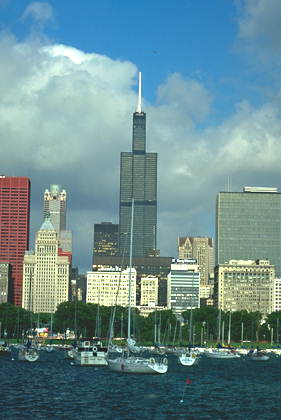 Чикаго. Вид на Даунтаун из гавани. На заднем плане — одно из самых высоких зданий в мире «Сирс-Тауэр» (443 м).