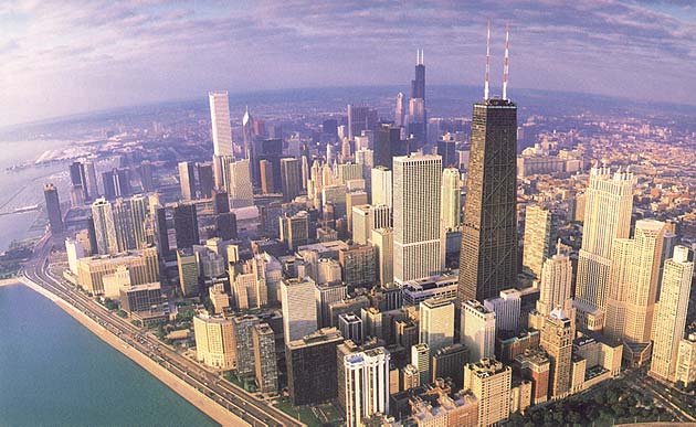 Панорама Чикаго: на переднем плане - небоскреб «Джон Хэнкок сентер» (100 этажей), на заднем плане - «Сирс-Тауэр» (110 этажей, 443 м).
