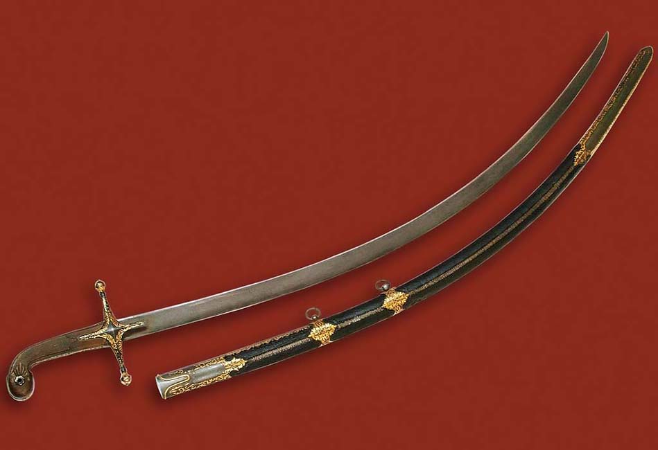 Шамшер (шемшир). Турция. Начало 19 века. Клинок сделан из булата сорта кирк-нардубан (сорок ступеней — лестница Аллаха). Металлические детали оправы выполнены из булата и украшены насечкой золотом.