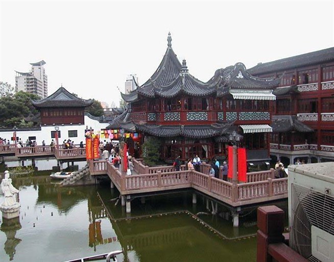 Посреди небольшого пруда стоит чайный домик Хусиньцин, попасть в который можно по зигзагообразному — для защиты от духов — мостику. Шанхай.