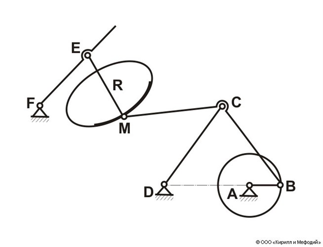 Схема шестизвенного шарнирного механизма для движения с остановками, преобразующего непрерывное движение звена AB в движение звена EF с длительными остановками в одном положении. В основе этого шарнирного механизма лежит круговой направляющий механизм ABCD, в котором длины звеньев подобраны так, что траектория точки М на участке, отмеченном на схеме жирной линией, почти совпадает с дугой окружности радиуса R. При движении точки М по этому участку звено EF остается неподвижным, если длина звена EM равна радиусу R и точка Е совпадает в это время с центром указанной окружности. При движении точки М по другому участку траектории звено EF перемещается на некоторый угол и возвращается в положение остановки.