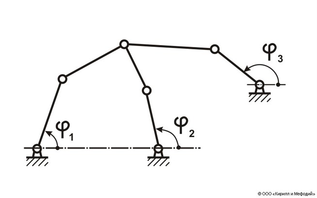 Схема шарнирного механизма с двумя степенями свободы (с двумя начальными звеньями). Независимыми переменными в данном случае могут быть либо углы φ