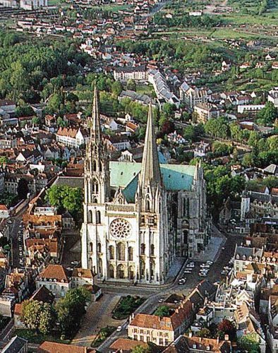 Собор Нотр-Дам. Западный фасад. Этот один из самых прославленных готических соборов построен на месте храма 11 в. в 1194-1225. Крипта 9-11 вв. сохранила остатки романских фресок. На фото представлен главный (западный) фасад с двумя башнями 12 в.