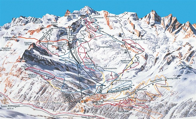 Швейцария.Схема горнолыжных трасс курорта Саас-Фе.