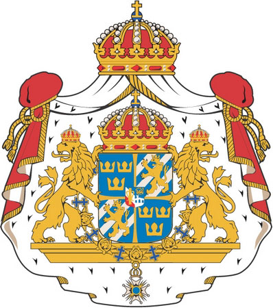 Большой государственный герб Швеции был принят 15 мая 1908 года. Лазуревое поле щита разделено золотым крестом. В первой и четвертой четвертях три открытые золотые короны. Во второй и третьей — три левые серебряные перевязи поверх которых изображен золотой коронованный лев. В центре щита — малый щиток, разделенный наискось лазурной, серебряной, червленой полосами. В правом поле малого щитка — золотой сноп. В левом поле трехарочный мост с двумя башнями, над мостом — золотой наполеоновский орел. Щит увенчан королевской короной и окружен цепью ордена Херувима. Щитодержатели — золотые коронованные львы с раздвоенными хвостами. Щит окружен пурпурной мантией с горностаевой подкладкой, увенчанной королевской короной.
