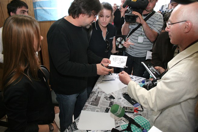 Юрий Шевчук раздает автографы на презентации сборника стихов «Сольник». 2009 год. Фото: KM.ru