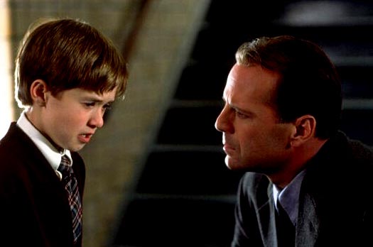 Брюс Уиллис в роли Малколма Кроу, Хейли Джоэл Осминт в роли Коула Сира. Фильм «Шестое чувство».