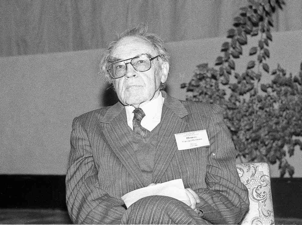 Академик Российской академии образования историк Сигурд Оттович Шмидт сидит в президиуме на конференции «Малые города России». 16 октября 1998 года. Фото: Ю.Н. Частов, pereslavl.ru