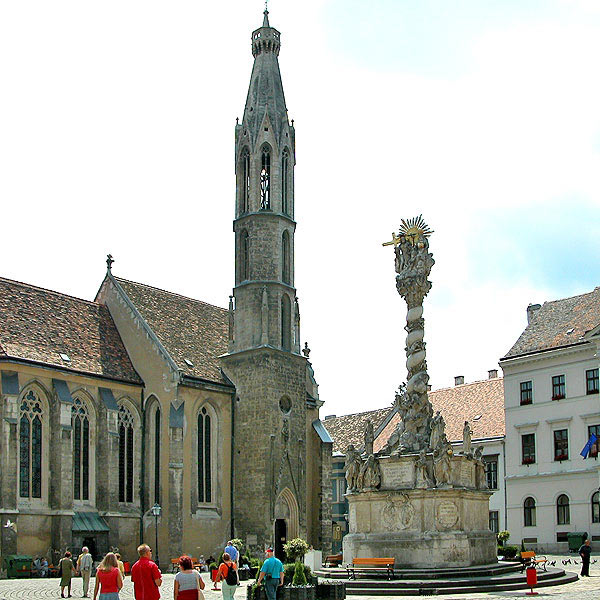 Шопрон. Бенедиктинская церковь (1280-1300), в которой трижды короновались венгерские правители, и колонна Св. Троица (1679).