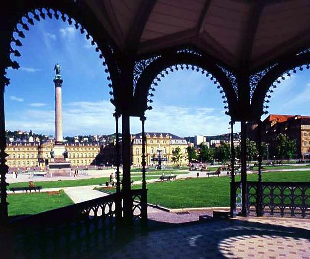 Штутгарт. Замковая площадь, в центре колонна с крылатой скульптурой герцога Христофа Вюртембергского, на заднем плане Новый замок.