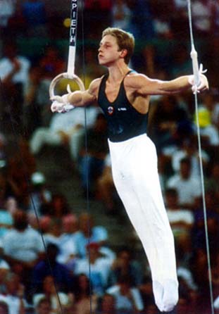 Виталий Щербо выполняет «крест» в упражнениях на кольцах.