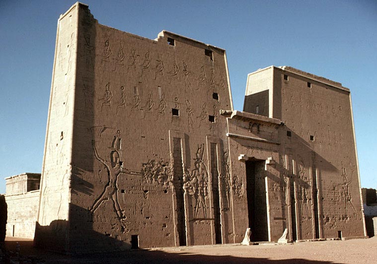 Эдфу. Храм бога Гора в Эдфу возводили в течение 180 лет. Его длина составляет 137 м, а высота пилона 36 м. Пилон храма украшен огромными рельефными фигурами Гора и Хатор. 1 в. до н.э.