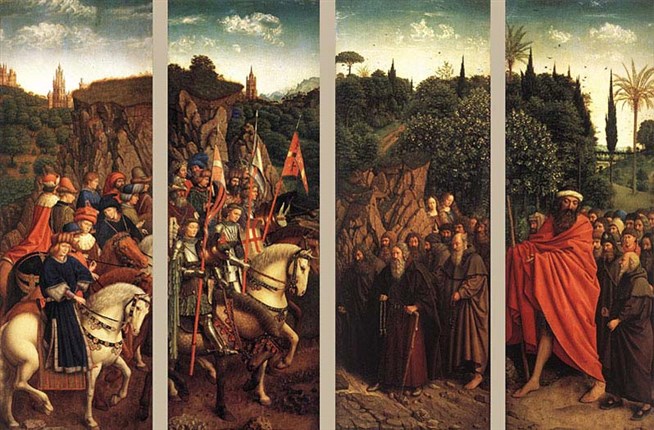 Ян ван Эйк. Изображение процессий праведных судей, рыцарей (слева) и отшельников (справа), идущих на поклонение Агнцу. Нижний ярус боковых внутренних створок Гентского алтаря.