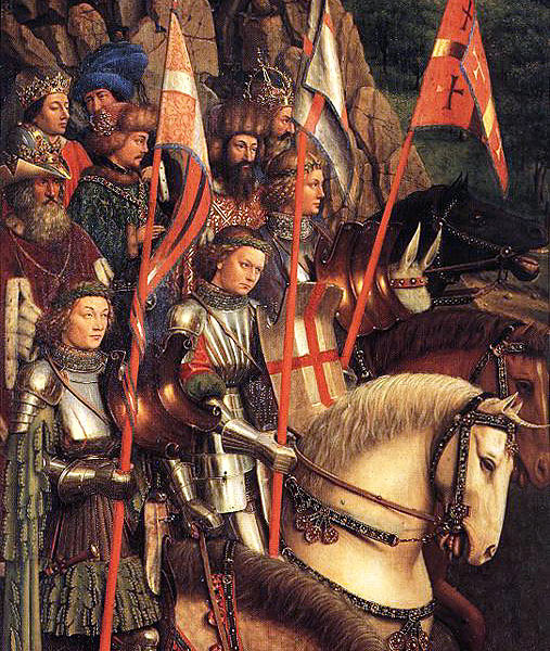 Ян ван Эйк. Фрагмент росписи боковой внутренней левой створки нижнего яруса Гентского алтаря, изображающий процессию праведных судей и рыцарей.