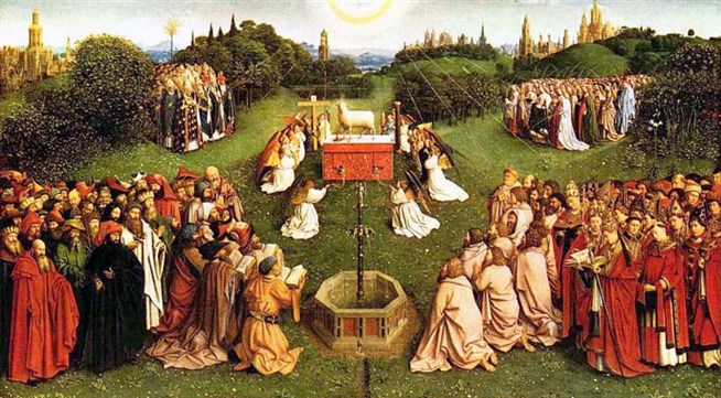 Губерт и Ян ван Эйки. Поклонение ангцу. Нижние пять досок внутренней части Гентского алтаря. 1432. Собор св. Бавона в Генте.