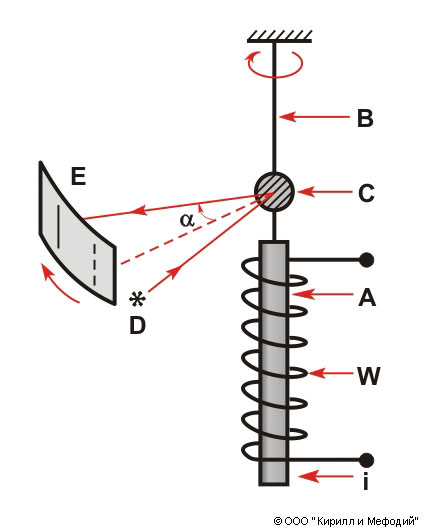 Схема установки для измерения эффекта Эйнштейна — де Хааза: А — образец; В — упругая нить подвеса; С — зеркальце; a — угол поворота образца, фиксируемый по изменению положения отраженного луча света; D — источник света; Е — шкала; W — намагничивающий соленоид, по которому проходит ток i.