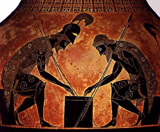 Ахилл и Аякс, играющие в кости. Фрагмент росписи чернофигурной амфоры Эксекия. 530-525 до н. э. Ватиканские музеи. Рим.