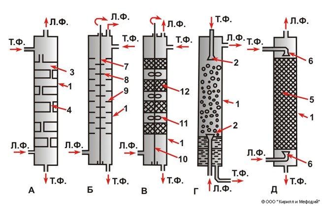 Схемы экстракционных колонн: а — колонна с ситчатыми тарелками; б — роторно-дисковый экстрактор; в — колонна с чередующимися смесительными и отстойными насадочными секциями; г — распылительная колонна; д — насадочная колонна; 1 — колонна; 2, 6 — распылители; 3 — ситчатая тарелка; 4 — переливные трубки; 5, 12 — насадки; 7, 10 — валы; 8 — плоский ротор; 9 — кольцевые перегородки; 11 — мешалки; Л. Ф. — легкая фаза; Т. Ф. — тяжелая фаза.