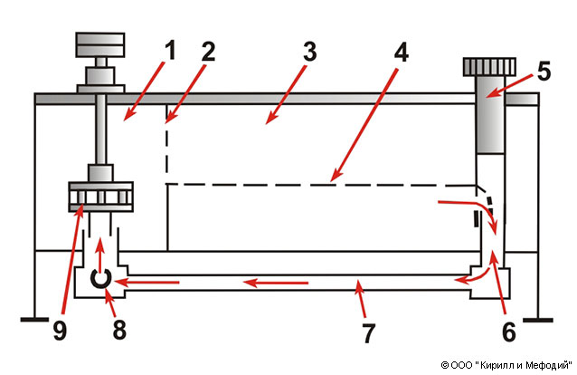 Ящичный экстрактор: 1 — камера смешения; 2 — жалюзийная перегородка; 3 — отстойная камера; 4 — граница раздела фаз; 5, 6 — регулирующие трубки; 7 — рециркуляционная трубка; 8 — всасывающий коллектор; 9 — турбинная мешалка.