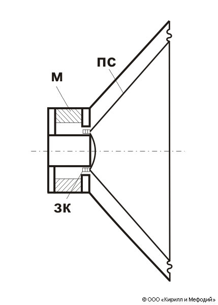 Схема электродинамического громкоговорителя прямого излучения: М — магнит; ПС — подвижная система (диафрагма); ЗК — звуковая катушка.