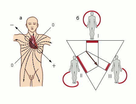 Электрокардиография (классические биполярные отведения): а) распространение по телу силовых линий биотоков сердца; б) схема, поясняющая различную амплитуду зубца R ЭКГ в трех стандартных отведениях (I, II, III).