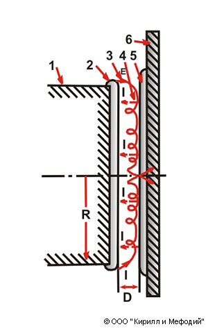 Схема сильноточного диода: 1 — катод; 2 — слой катодной плазмы; 3 — типичная траектория электрона в диоде, имеющая спиралеобразную форму; 4 — типичная траектория иона в диоде; 5 — слой анодной плазмы; 6 — анод.