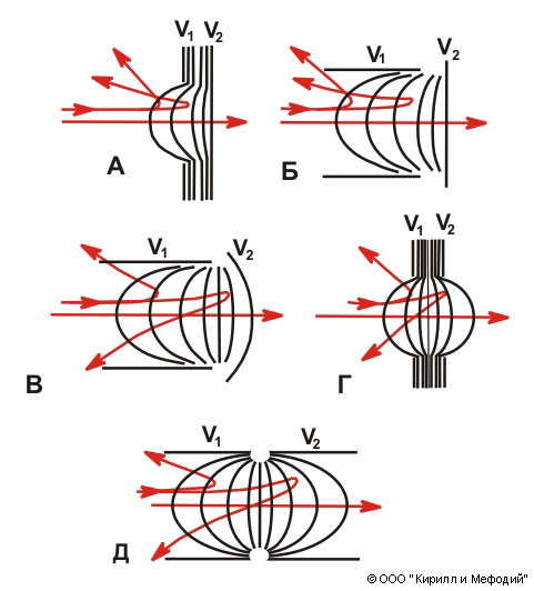 Осесимметричные двухэлектродные электронные зеркала: V1 и V2 — потенциалы электродов; тонкие линии — сечения эквипотенциальных поверхностей плоскостью рисунка; линии со стрелками — траектории электронов с разной энергией. Зеркала а и б всегда рассеивающие; зеркала в, г и д могут быть как рассеивающими, так и собирающими.