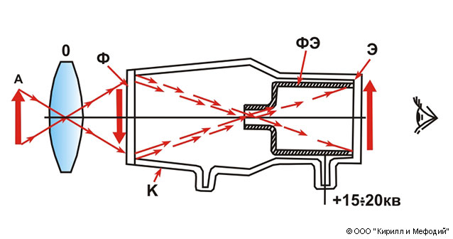 Структурная схема электроннооптического преобразователя: А — объект наблюдения; О — объектив; Ф — фотокатод; ФЭ — фокусирующий электрод; Э — люминесцентный экран; К — стеклянный или керамический корпус; стрелками показан ход лучей вне (оптических) и внутри (электронных) прибора.