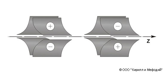 Дублет из двух квадрупольных электростатических линз, поля которых повернуты вокруг оптической оси z системы одно относительно другого на угол 90°.