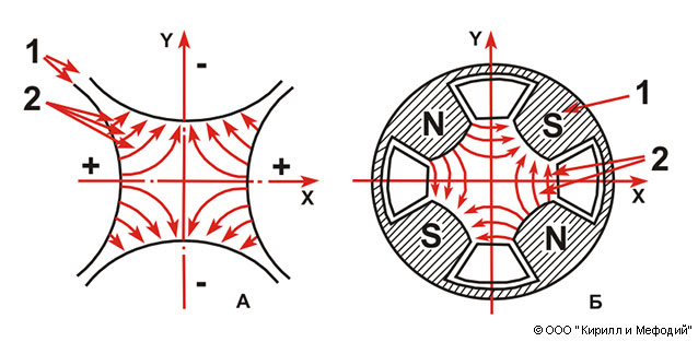 Сечения квадрупольных электростатической (а) и магнитной (б) электронных линз, перпендикулярные направлению движения пучка заряженных частиц: 1 — электроды; 2 — силовые линии полей.