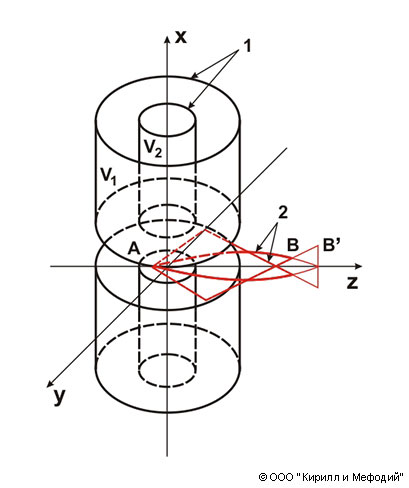 Электростатическая трансаксиальная линза с электродами в виде двух соосных цилиндров и с кольцевыми щелями для пропускания пучка частиц: 1 — цилиндрические электроды; 2 — траектории заряженных частиц; V1 и V2 — потенциалы электродов. Пучок, выходящий из точки А предмета, после прохождения поля линзы становится астигматическим и образует два линейных изображения В и B'. При определенном подборе параметров линза может давать стигматическое (точка в точку) изображение.