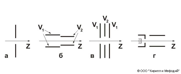 Сечения электродов электростатических цилиндрических линз плоскостью, проходящей через ось г перпендикулярно к средней плоскости: а — цилиндрическая (щелевая) диафрагма; б — иммерсионная цилиндрическая линза; в — одиночная цилиндрическая линза; г — катодная цилиндрическая линза; V1, V2 — потенциалы соответствующих электродов.