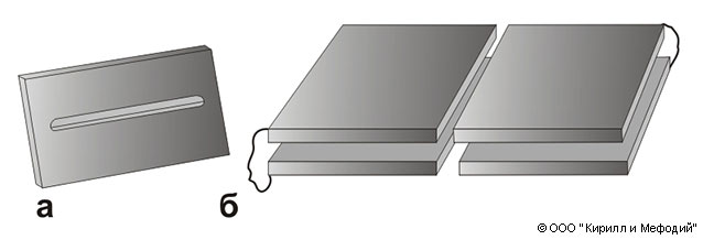 Электростатические цилиндрические линзы: а — диафрагма со щелью; б — иммерсионная линза, составленная из двух пар пластин. В области прохождения заряженных частиц поля линз не изменяются в направлении, параллельном щелям диафрагм или зазорам между пластинами соседних электродов.