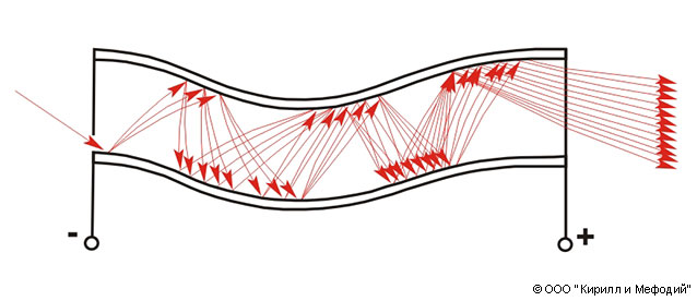 Размножение электронов в канальном электронном умножителе: знаками + и — обозначены полярности приложенного к каналу напряжения; стрелками показаны траектории электронов.