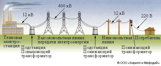 Схема высоковольтной линии электропередач, доставляющая электроэнергию от тепловой электростанции до потребителя.