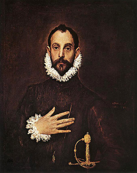 Эль Греко. «Портрет кавалера с рукой на груди». 1577-79. Мадрид, Прадо. Одна из ранних работ кисти Эль Греко, лучший образ испанского дворянина того времени.