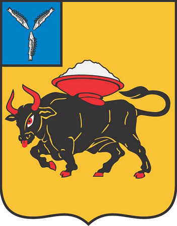 Герб города Энгельс и Энгельсского района. Золотое поле символизирует хлебное богатство Заволжья, а бык с солонкой напоминает о Покровской слободе, как перевалочном пункте на пути с озер Баскунчак и Эльтон.