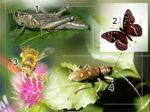 Изучением насекомых занимается особая наука — энтомология. Насекомые — представители отрядов: 1 — прямокрылых, 2 — чешуекрылых, 3 — перепончатокрылых, 4 — жесткокрылых.