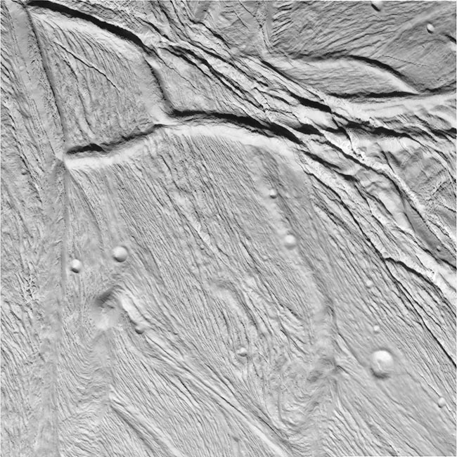 Поверхность Энцелада. Фотография сделана АМС «Кассини» 17 февраля 2005 с расстояния 10750 км.