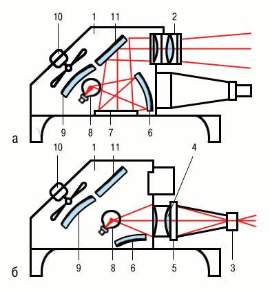 Схема эпидиапроектора: а — эпипроекции; б — диапроекции; 1 — кожух; 2 — объектив эпипроектора; 3 — объектив диапроектора; 4 — конденсор; 5 — рамка диапозитивов; 6, 9 — сферическое зеркало; 7 — непрозрачный оригинал; 8 — источник света; 10 — вентилятор; 11 — плоское зеркало.