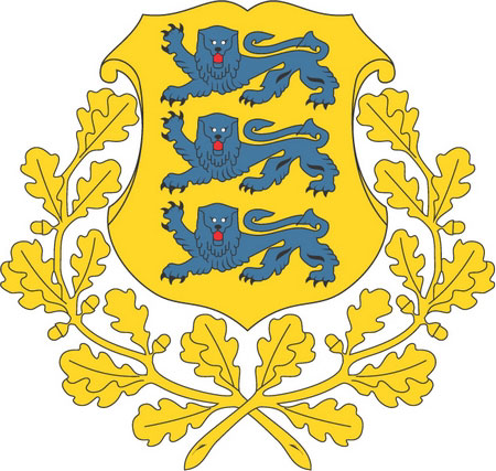 Герб Эстонии был принят в 1990 году. На большом гербе Эстонской Республики на золотом фоне исполненного в стиле барокко щита изображены три льва-леопарда синего цвета с языками красного цвета и глазами серебряного цвета. С трех сторон щит окаймлен венком из двух скрещенных дубовых веток золотистого цвета.