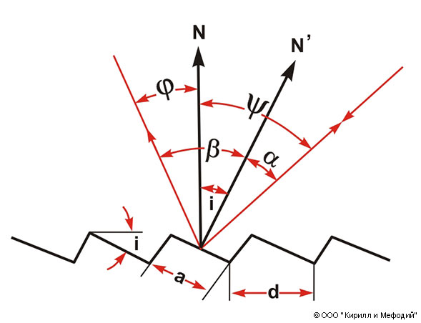 Схематическое изображение участка поверхности эшелетта и хода лучей, падающих на него и дифрагирующих на нем: а — ширина зеркальной грани штриха; d — постоянная эшелетта; N — нормаль к общей поверхности эшелетта; N' — нормаль к зеркальной грани штриха («у.
