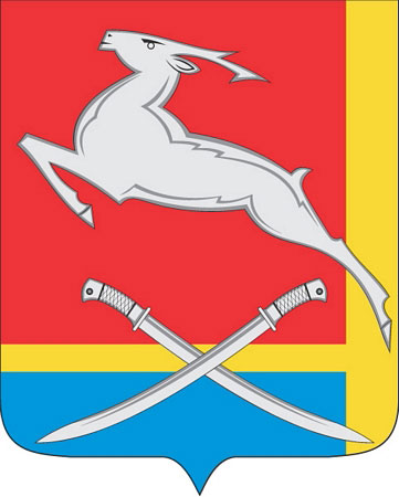 Герб Южноуральска, принятый 26 сентября 2000 года. В червленом (красном) поле с золотым краем лазоревая (синяя, голубая) оконечность, окаймленная золотом. Поверх всего серебряная скачущая косуля над двумя серебряными шашками накрест.