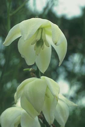 Крупные колокольчатые цветки юкки нитчатой (Yucca filamentosa) собраны в верхушечную метелку, длина которой достигает 2 м.