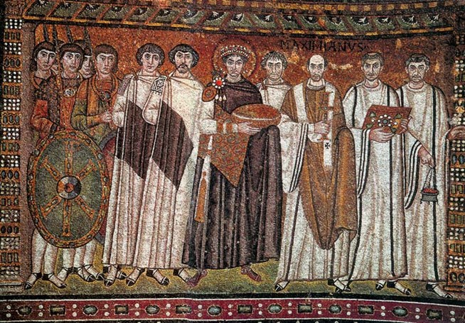 Император Юстиниан со свитой. Мозаика церкви Сан-Витале в Равенне.