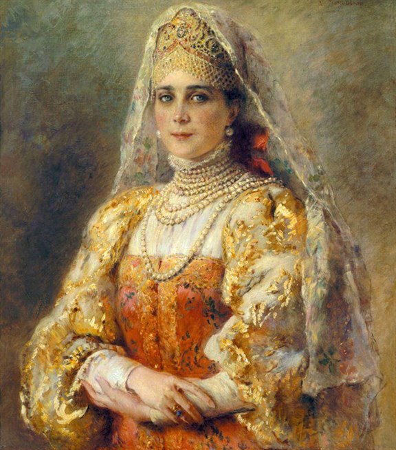 К.Е. Маковский. Портрет княгини Зинаиды Николаевны Юсуповой в русском костюме. 1900-е годы. Холст, масло. Государственный исторический музей, Москва. Портрет находился в доме князей Юсуповых в Большом Харитоньевском переулке в Москве.