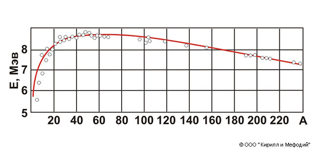 Зависимость удельной энергии связи ядер от числа нуклонов.