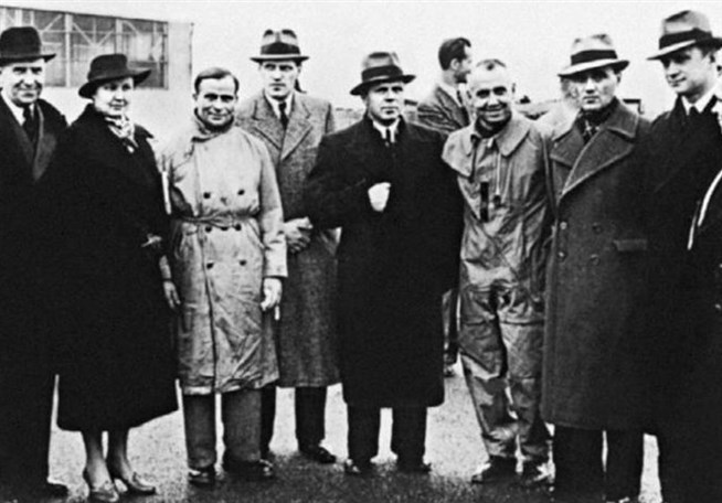 На авиационном заводе в Германии. Справа налево: участники войны в Испании генералы В.И Шевченко и А.И. Гусев, А.С. Яковлев, немецкий летчик-испытатель, И.Ф. Петров, В. Мессершмитт, немецкий летчик-испытатель, переводчица Н.П. Петрова, представитель немецкой фирмы. Весна 1940 год. Источник: Якубович Н. Неизвестный Яковлев. «Железный» авиаконструктор. 2012.