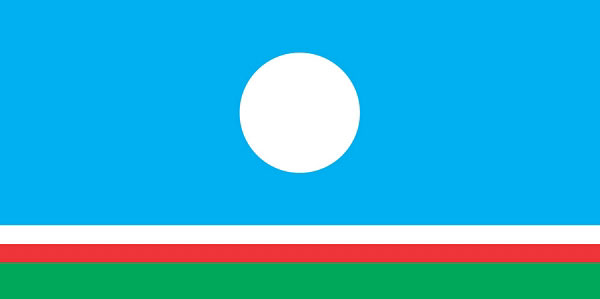 Флаг Республики Якутия был принят 14 октября 1992 года. На середине голубой полосы расположен круг белого цвета. Якуты считают себя «детьми белого солнца».